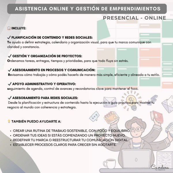 💻 Asistencia online y gestión de emprendimientos – planificación de contenido, organización de tareas, asesoramiento y redes sociales.