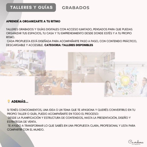 Mi trabajo consiste en acompañarte —de manera presencial o virtual— en cada proceso donde la organización marque la diferencia: en tus espacios, en tu rutina, en tu emprendimiento o en tus proyectos personales.