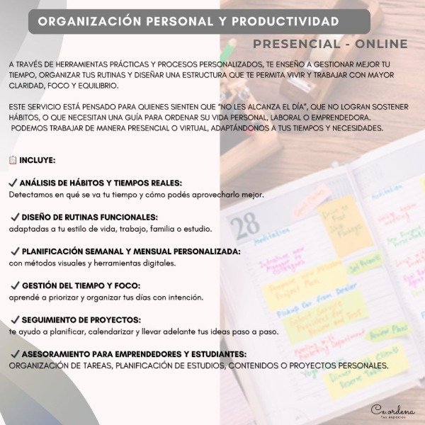 Te ayudo a ordenar, planificar y simplificar, para que puedas recuperar el control, aprovechar mejor tu tiempo y disfrutar más de lo que hacés.