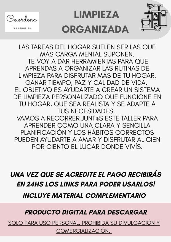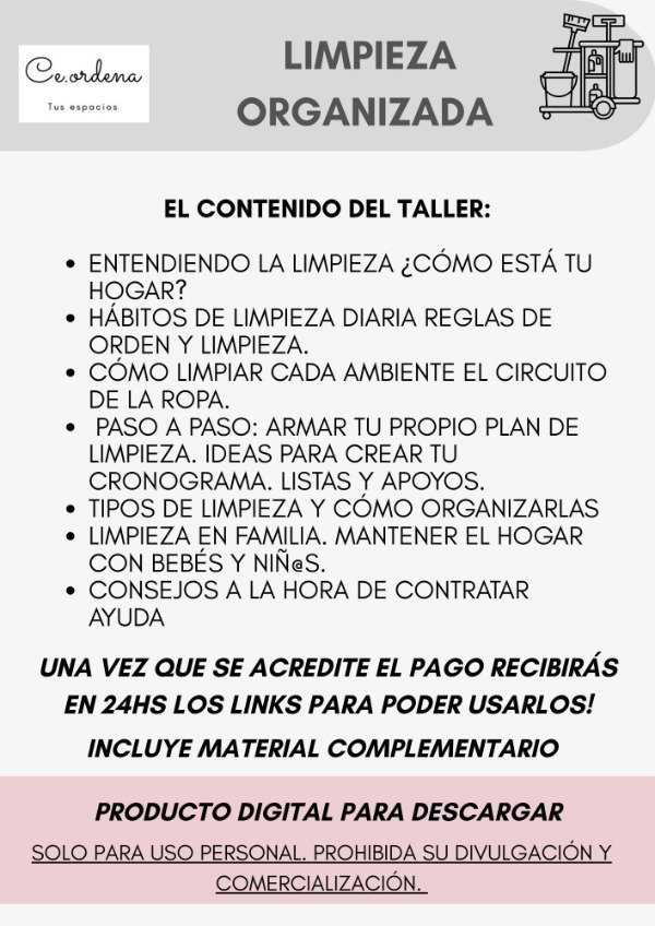 En este taller grabado vas a encontrar herramientas prácticas para organizar tus rutinas de limpieza y así: