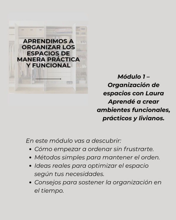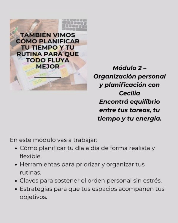 Durante 3 horas, Laura (organizadora de espacios) y Cecilia (organizadora personal y especialista en planificación) te guían paso a paso para lograr una transformación completa, tanto en tu entorno como en tu organización diaria.